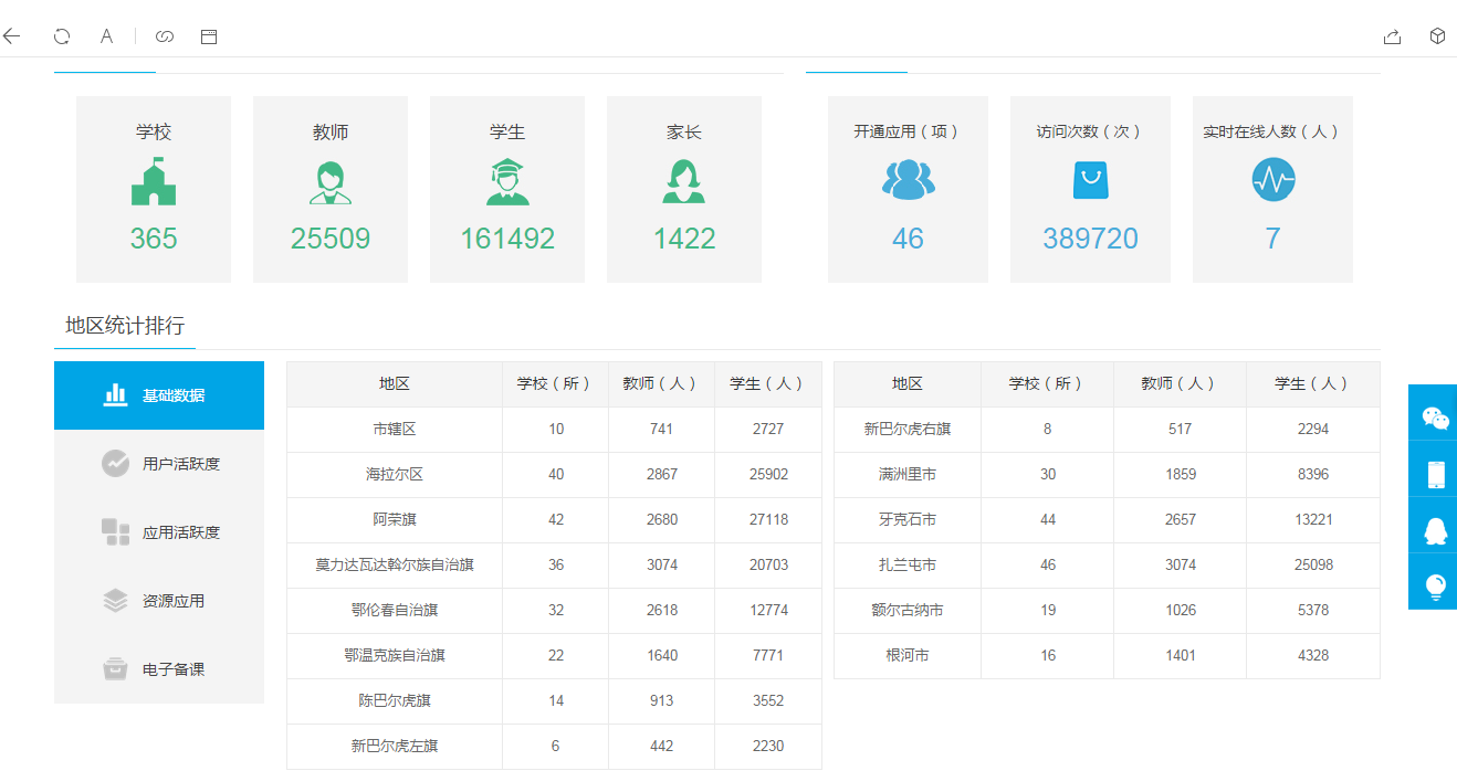 數(shù)據(jù)統(tǒng)計(jì):支持學(xué)??勺远x時(shí)間段統(tǒng)計(jì)本校設(shè)備的使用率和老師的使用時(shí)間;支持周期統(tǒng)計(jì)(年月周)設(shè)備在班級(jí)的使用時(shí)長(zhǎng)、設(shè)備告警,媒體推送的次數(shù),資源上傳。